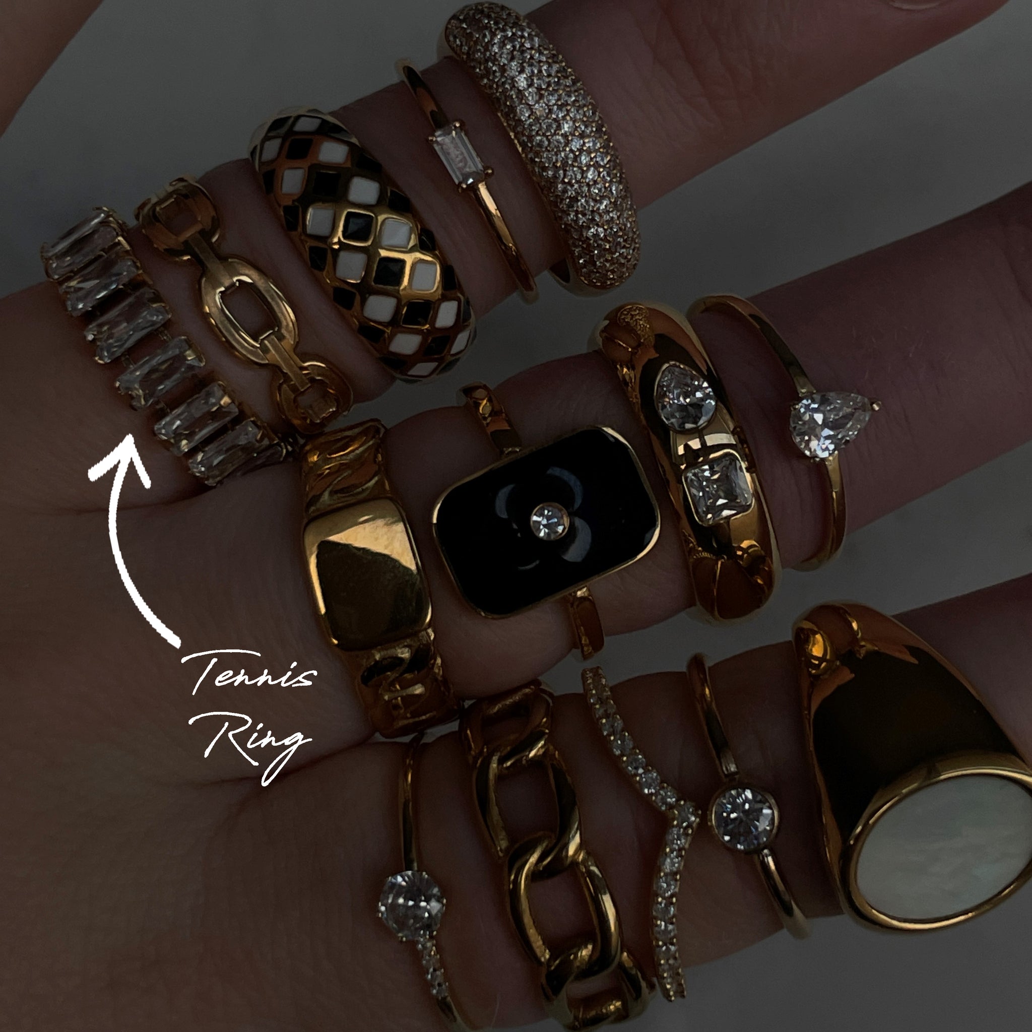 The Tennis ring has an intricate cubic zircona detailing with a flat lay. Wear the matching Golden Hour Co. Tennis choker to create a complete look.